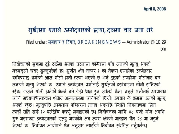 Mine is Jhapa District. Constituency No. 5, 6, 7 will be of CPN UML. There are Tara Soymyanga, K.P Oli, and Deepak Karki. These are such constituency where even dogs and goats will win if they are contesting from CPN UML. People just see SUN as it is stronghold of UML. Now, No. 4, NC has slight lead over UML as NC candidate is a strong heavyweight politician-Chakra Prasad Bastola as compared to UML's Debendra Dahal. No. 3 will have the fierce competition between present Home Minister Krishna Sitaula and UML's Puspa Pokhrel. But, UML is slightly strong here. Jhapa No. 2 has not much heard candidates from both parties-NC and UML. But, NC's candidate is slightly popular. so, NC has lead here. No. 1 also as of now, not much decided. but seems that NC has slightly bigger lead than UML. So, in Jhapa, it may be something like UML-4 and NC-3 in final result. Rest of the parties and candidates get few thousand votes.