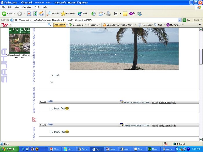 यसपालीको चौतारी डाँडा पाखा कुना काप्चा सबै छाडेर समुन्द्रको किनारमा राखिएको छ। यो पल्टको गर्मी महिनामा यहिँ बसेर केहि छिन पौडी खेल्दै, केहि छिन रमाइलो गर्दै बिताउनु हुन सम्पुर्ण चौतारीबासी दाजुभाई तथा दिदीबहिनीहरुमा चौतारी फलोस-फुलोस समिती निवेदन गर्दछ!