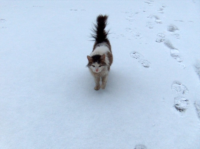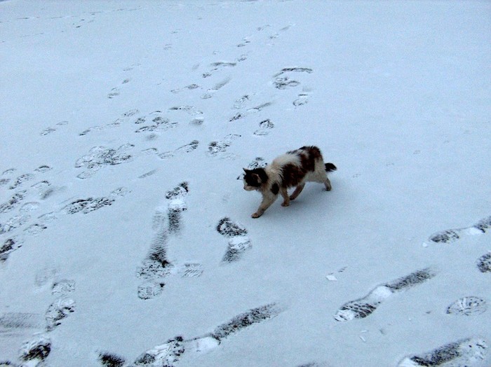 Cat walking on frozen lake, temp -15 degrees Celsius