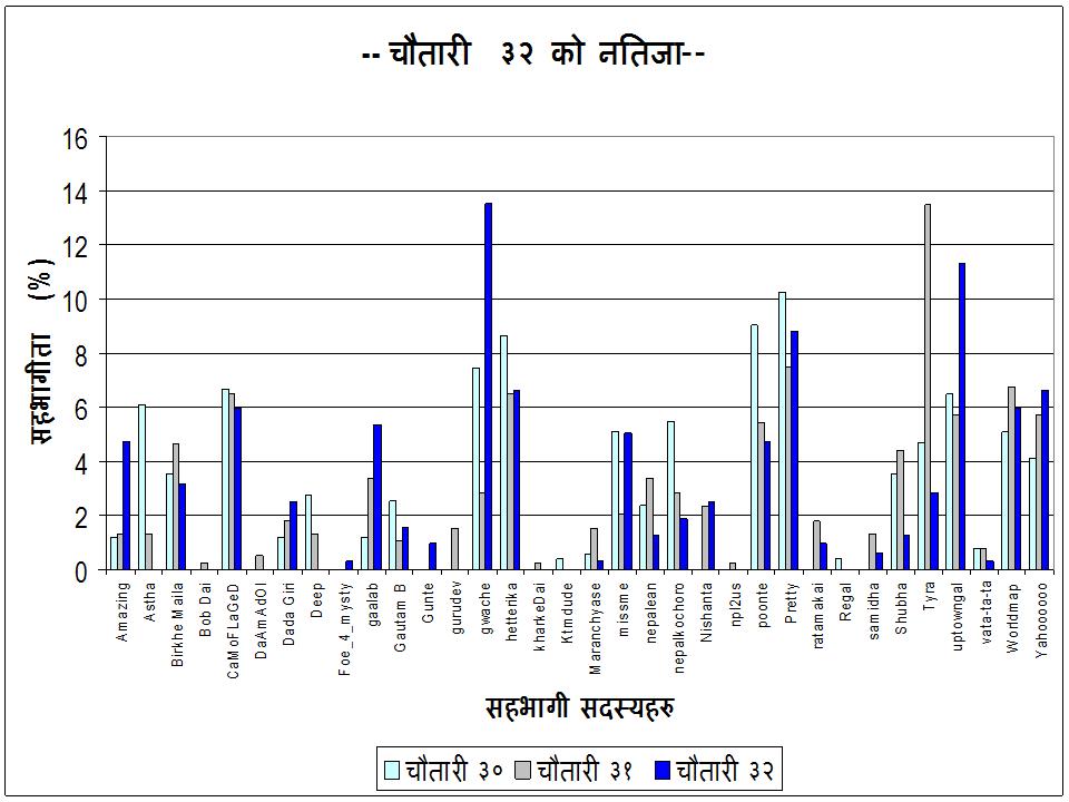 चौतारी! चौतारी!!चौतारी!!! गाम-ठामको कामलाई एकछिन छोडेर, थकाइलाई मेट्ने ताजा खाजाको रुपमा साझा मार्फत चौतारीमा दौंतरी खोज्दै आउने सम्पूर्ण गाम्लेहरू तथा शुभचिन्तकहरूलाई गफ रुपी खाजा सजाउँदै, बाजा बजाउँदै न्यानो अभिवादन!!! उकाली-ओराली, हिउँद-गृष्म, दशैं-तिहार गर्दै, हाँस्दै-खेल्दै, ठट्टा गर्दै चौतारी ३२सौं भागमा आईपुग्दा नयाँ पुराना गाउँलेहरू तथा शुभचिन्तकहरूको न्यानो माया, सद्भाव र शुभेच्छा पाएर द्रुत गतिमा प्रगतिपथमा लम्कँदै गइरहेको छ। चौतारीको निरन्तरता साझा मैं एक अभूतपूर्व कीर्तिमान हो भन्नु अत्युक्ति नहोला। नेपाली जनजिब्रोलाई माया गर्ने, नेपालीपनमा रमाउने र एकअर्का प्रति बन्धुत्त्व, सद्भाव एवं मेलमिलापको दृष्टीले हेर्ने सबै नेपालीका लागि चौतारी एकताको अनुपम नमूना हो। चौतारीमा पाल्नुहुने गाम्लेहरूको प्रयोग गर्ने नाम र चौतारीको नाम प्रथम पृष्ठमा राख्ने जमर्को गरेको छु। अरू पनि थुप्रै गाम्लेहरू हुनुहुन्छ जस्का चौतारीको नाम जुरेको छैन, तिनका नाम अन्त्यमा राखेको छु। साथै हालसम्म चूपचाप रमाईलो मानी चौतारी पढिदिनेसाथीहरूलाइ पनि यसमा भाग लिई चौतारीको रौनक बढाईदिनुहुन अनुरोध गर्दछु। Nepe – नेपे दाजी, Birkhe_Maila – जिम्माल बूढा, जिम्माल बा, बिर्खे माइल्दाइ, Dada_Giri – दादा, दादा बुरो, Nepesahila – साहिंला, Poonte – पून्टे दाई, पून्टेद, Kick – काका, GautamB. – गोताएँ, गोतामे ज्यू, Shree5 – सिरे, Bhaute – भउते, भौतेकाजी, Nepalean - नमे, Amazing – आइते, जंगे, Sandhurst_Lahure – लाहुरे जेठा, Camoflaged – कुम्ले, Miss_me – मास्टर्नी दिदी, मास्टर्नी नानी, मिस्, Pretty – सान्नानी, Uptowngal – ठूल्नानी, ठूली, Tyra – तितौरी, तिरू, Nirman – निरे, Ruina – रूइना, Matrix_rose – पुष्पपुरी, Ocean – मु्न्द्रे, Lau_ta_lau – लाले, Bostonian_nepali – बेंसीथाने नेपाली, Sano_kanchha – सान्कान्छा, Ishwor – ईश्वर, Floraj – फुलौरे, ज्योतिष महाराज, World_map – चित्रे, Echoes – धने, Dalli_Resham – डल्ली फुपू, Subha – सुभे, शुभ दिदी, Chipledhunga – चिप्ले, Foe_4_Misty – मिस्टे, Gwanche – ग्वाँचे, Sajha_user – सन्जु, Vata-ta-ta – भट्टे, Gaalab – गाले, Lootekukur- लुते, Sherpini – शेर्पिनी, Ma_chameli – चमेली, Ramkisne – रामकिस्ने, Nepal_ko_chora- नेप्चे, Cerine – सेरू, Yahoooo – यामे, Harke_kailo – काहिंला, Nails- चरिनंग्रे, Bob_dai – बबे दाई, Deep- दीप ज्यो, Gurl_Interrupted - ईन्द्रेणी , Manepaliketa - माने, Kalankisthan - कैले , Hetterika!! - हरितालिका, Regal - राँगे, रिकुटे, Juggy - जग्गे, मरन्च्यासे - च्यासे पिकरेली, काने, मुखियाबा सुर्जे, नयाघरे, पहालवान, याङ्गे, नटे, लन्लि, समिर, बेमानि ,आशे, परदेशी, पानपाते ,हर्के, बिनोदे , याक्कु, राधा, हिते ,नारने, झाक्री,पिरो मरिच,परबर् ,राते ,कटरिना, रामे, माने, हिमाल