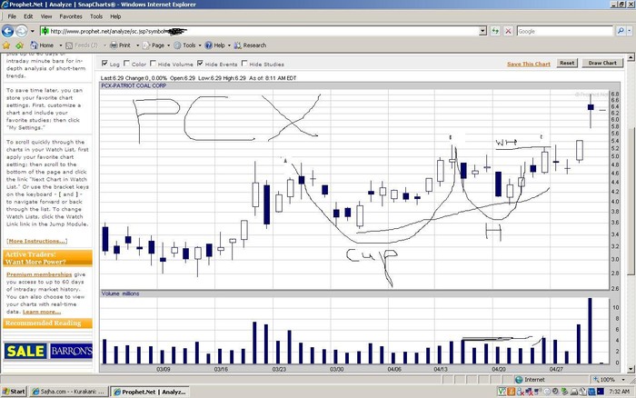 Bisal, I don't know what to say except Good Luck. They are cheap for a reason. Where the stock was in the past is not important, we should be concerned about where it will be in the future. FF, I usually look at daily charts for the pattern but use the weekly to determine the trigger. Once the handle is formed, I look at the previous week's high and buy it when the price gets to 1% of the high. If the price is above 5% of the high I let it go. The attached chart is for PCX which I had recommended on Sunday. The stock rallies to pt. A and sells off, then again it rallies to pt. B and we see another pullback. The pullback is less than the previous pullback from pt. A, so this makes the formation of a cup and a handle. I noticed this on Sunday and the last week's high was $5.24. So my trigger in this case was 5.24 X 1.01 = 5.29 and the maximum buy price was 5.24 X 1.05 = 5.50. This meant that I'll buy once price gets to 5.29 and the most I was going to pay for the stock was 5.50. Once you are in it put your stop and enjoy the ride. Hope this helps!!!