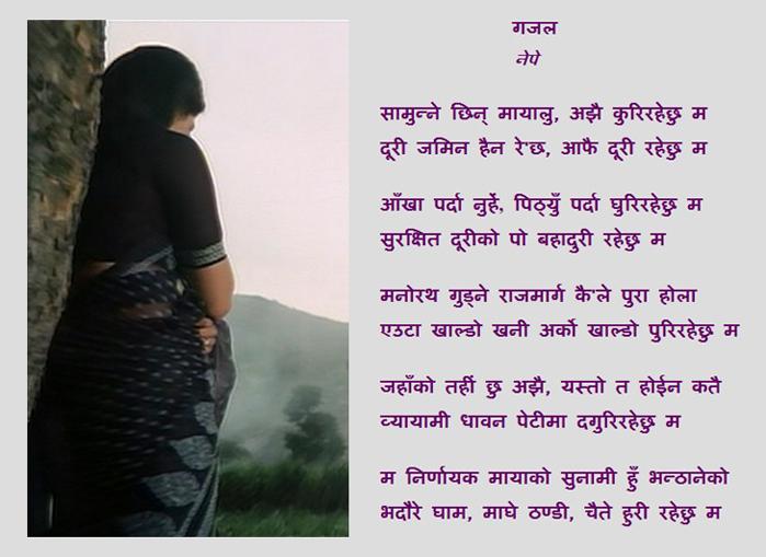 यस्तो पो हुनु पर्छ गजल भनेको ! नेपेको लेखाईको देखासिकी गर्छु होला ! बष्टनमा हुने भनेको साहित्यिक कार्यक्रममा यो गजल पाठ गर्ने अनुमति पाम् ! सामुन्ने छिन् मायालु, अझै कुरिरहेछु म ! दूरी जमिन हैन रे'छ, आफै दूरी रहेछु म ! आंखा पर्दा नुहें, पिठ्युँ पर्दा घुरिरहेछु म सुरक्षित दूरीको पो बहादुरी रहेछु म ! मनोरञ गुड्ने राजमार्ग कै'ले पुरा होला एउटा खाल्डो खनी अर्को पुरिरहेछु म ! जहांको तहीं छु अझै, यस्तो त होईन कतै ब्यायामी धावन पेटीमा दगुरिरहेछु म ! म निर्णायक मायाको सुनामी हुं भन्ठानेको भदौरे घाम, माघे ठण्डी, चैते हुरी रहेछु म !