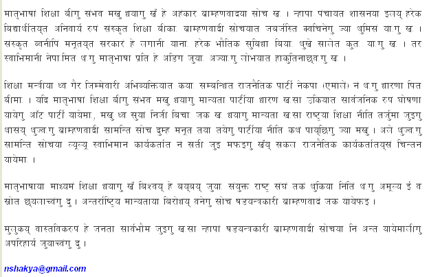 NOTE: The opinions here represent the opinions of the individual posters, and not of Sajha.com. It is not possible for sajha.com to monitor all the postings, since sajha.com merely seeks to provide a cyber location for discussing ideas and concerns related to Nepal and the Nepalis. Please send an email to admin@sajha.com using a valid email address if you want any posting to be considered for deletion. Your request will be handled on a one to one basis. Sajha.com is a service please don't abuse it. - Thanks.
