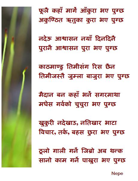नेपे जी, तपाईंको रचना पढें, हृदय छोयो । तर नि केही टिप्पणी गर्ने धृष्ट्रता गरेको छु ।, सहज भाव ले लिनु हुने छ। सम्कालिन साहित्यमा चेतना को अभिबृद्दि हुनु मा जन आन्दोलन भाग् २ को समय प्रभाव पनि महत्वपूर्ण मान्नै पर्छ। शुल्क तिरेर कबिता श्रवण गर्ने परम्परा आन्दोलनमय वतावरण कै उपज हो जस्तो लाग्छ। अन्य बिधाका कबिता बाचन् मा पनि तेति कै आकर्षण रहे साच्चै नै नेपाली सहित्यकापारखिहरुको गुणात्मक बृद्दि भएको मानिने छ। क्रान्तिको गीत् मात्र कबित भन्ने पक्षमा म छैन। निश्चय नै श्रवण मुकारुङ्, बूंद राना ले नेपाली सम्कालिन् काब्य जगत्को प्रतिनिधित्व गर्दछ। अर्जुन् पराजुली को अन्य जीवन् जगत्को कबिता सुन्न, पध्न बाकि नै छ, त्यसले उहाँको बारेमा टिपाणि गर्न मनासिब् देख्दिन। अस्तु!