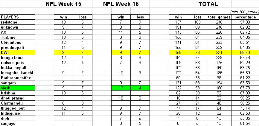 week 16 results.... Chargers are for real... how far can teams from PA go with out marquee players (big ben and TO)??? I hope to see bledsoe and the Bills crew in postseason..... what's up with NFC, especially west... it seems 8 and 8 teams will be playing after next weekend....