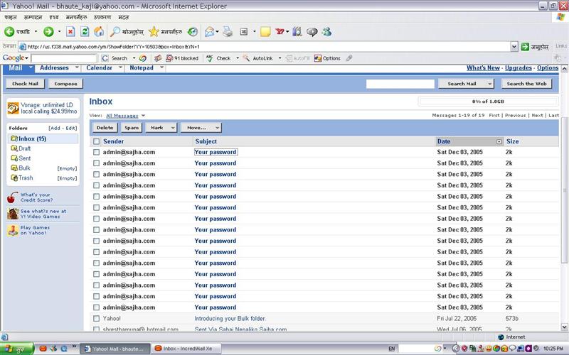 खै मेरोमा त केहि पनि छैन त? हे सुरज ...हे नारायन... आचार्य गुरु! लौन मेरामा पनि कृपागरी पाउँ। कि साझाका स्पेशल मान्छेकामा मात्र? नत्र त मेरोमा पनि आउनु पर्ने हो क्या रे---- जति पटक हेर्दापनि खालिको खालि मेलबक्स त! सधैँ खाली खाली मेलबक्स हेर्दा हेर्दा कहिलेकाहि त जन्कसन्क भएपनि "ए मेल त आएछ गाँठे" भनेर सन्तोक त लाग्थ्यो कि? ----- ओके