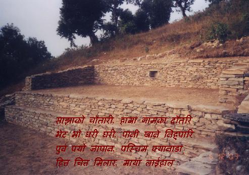 यो चौतारिया त छपनि थपिएको थपिएइ छ , झन झन कुदेका छपनि पो देखिन थाले! गाम ठामको सम्झना मेट्न फुटेकै ढुङा त काफी छन, कुदेका छपनि ले त मोहनि नै लाए । यसो ट्याम मिल्यो कि केइ ने केइ निहु पारेर दम्तरिहरु आइ हाल्चन केरे । मिठा मिठा गफले त एकैछिनमा गाम पुगिन्च केरे । कस्तो मिलार कुरा अर्चन यि दमतरि हरु, जति पढे नि मनै भरिन्न के, पढम पढम हुन्च । दमतरिहरु फेरि नि जुटम, उहि छापाको चोतारिमा, मिठा कुरा कुरा अरेर मनै हलुंगो बनाम, मनै खुसी बनाम , फेरी फेरी केइ निहु पारेर चौतारिमा खुसुक्क आउने माया लगाम । पुराना छपनि हेर्न तलका पाइटा समातम । भउते हरायो चौतारी १ चौतारी २ चौतारी ३ चौतारी ४