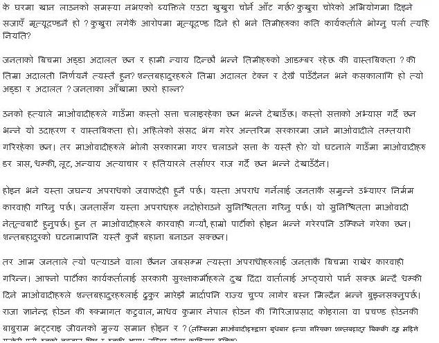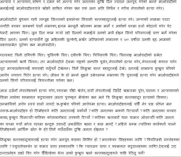 Most people rely their thought on prejudice. "Maoists are bad. All this people have died because they started the war." I think, that is the very absolute way of thinking. If we know how to think things relatively, not necessarily from different perspective; our mind will prod into the things and analyze "as they are." The tinge of Vipassana appeared in this thread.... Vipassana simply teaches to accept things as they are, not to distort them. Had it not been the Maoist movement, we would have been still living in neo-pancha's rule. The dang political parties who were always, always afraid of talking about republic, wouldn't have dared to go against Gyanendra's wishes. They would just talk a lot, and be a Nepali neta. Folks, it is time to move ahead. Why Nepal still has to be the second poorest country? Is it because of Nepali people? Partially, maybe, (and that could be one perspective), but it is because of the Neta who were supposed to "lead" the country. They were supposed to track the country and people to the progress.. I recall what one of my brothers said: If we just switch all the people of Nepal and Japan to each other's country empty handed, in 5 years the Japanese will make Nepal Japan-like, but, Japan will be Nepal-like. It all depends on the "Administrator" that administers how to take care of things. The worst "administrators" of Nepal are the ones who are to blamed for the life majority of people are living today. When someone dies, the "death" is just so blatant. When it is said, "killed," it is connotative and we think in negative terms. It is sad, indeed, when a Nepali dies, but the war is so cruel, it kills many people and many bad things happen and the written law always doesn't apply.... My respected father passed away because of brain hemorrhage. He was very healthy. The place in Lamjung I live in is some 130 KM from KTM. If it was in the US, it is little more than an hour's drive...my father was supposed to be in hospital within 24 hours at any cost...but it took more than 24 hours...it took more than 24 hours to get him to KTM ...130 KMs....he didn't make it..he passed away...he would have survived had he gotten in KTM in time..but why my father had to pass away? Why? It is because of the "terrorist" Netas that wanted to have so much fun in the corrupted regime. My father didn't make it because he had brain hemorrhage...there are many other fathers/mothers/sons/daughters have to die because they don't have access to Cetamol..Why is that? Is it because of Maoists? We have to change the way we are living now. We have to get rid of the prejudice and think the things from new dimension. Realistically, stading on the ground reality.