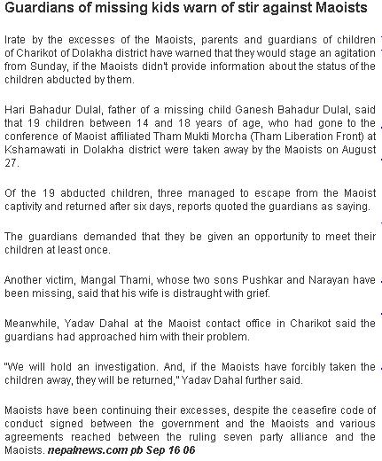 Worst part of maoist is how they have used minors for thier use. Many of the maoist gorillas are under 18 years of old. The villages of nepal was devoid of youngsters because if they have stayed maoist force them to join in the war. Read the another story of your beloved maoist who has targeted kids.