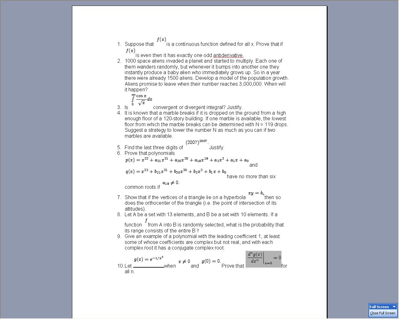 The ISMAA (Illinois Section of the Mathematics Association of America) is holding a math competition this month. The following are the question they have asked. They accept answers from anyone. Pirst Prize: $500 (right answers to all the questions) Second Prize: $350 (Right answer to 8 questions) Third Prize: $200 (Right answer to 5 questions) Lets make Nepal Proud. Lets take all the prizes ourselves. Please don't forget to include your address and/or phone number when you give answers so that they can send you a check. The name of the winners can also be viewed at http://ismaa.knox.edu/ Good luck. Here are the questions.