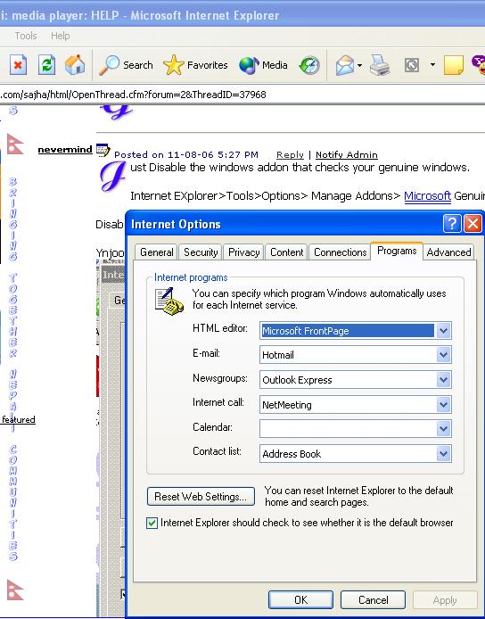Hey guys, I have a problem...I have Windows XP (not a genuine version)...and Windows media player (v 10) was uninstalled last week in reboot process. Now I tried to download Windows media player from windows' website but it asks me to validate my windows version... I can't do that because I dont' have a genuine version.. Is there any other way to download WMplayer 10 (or 11)? Please help.