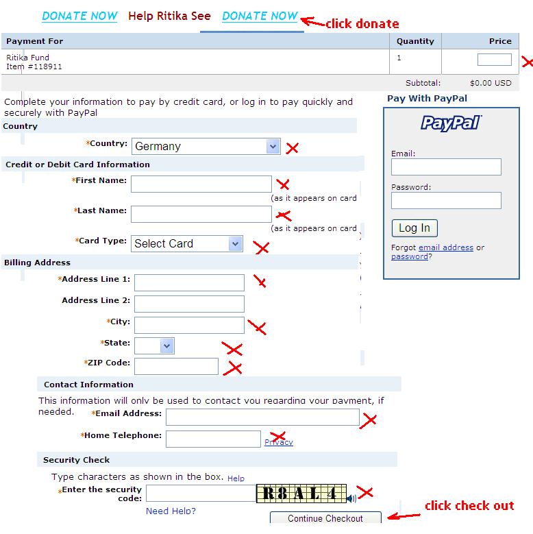 hey san bro...i tried do donate some in the name of sis Ritika but i couldnt because of this shit paypal ..saypal whatever...i donno what is that...i simply have a bank account in Deutsche Bank and i donno how to transfer this amount in Ritikas name...there is one possibility..i got a credit card ...ill trust u n give u the nummer ..plez collect 100 EURO from my side in Ritikas name...hope to hear from u...Chow