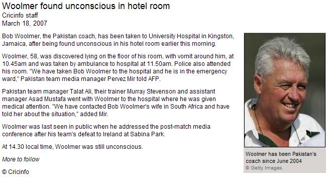 What a shocking news!!!!!!!!!, Just yesterday, i was watching the game and saw red and worried face Bob Woolmer as pakis were getting nailed by irish, and today to read the news about his death!!!!! just never expected.. i supported pakis many times and they are one of my fav teams, but due to their recent troubles with the players, I wanted Ireland to win. It is very rare or never that I had truly supported the opposite team (Ireland), but than this incident happened. RIP Bobbie..