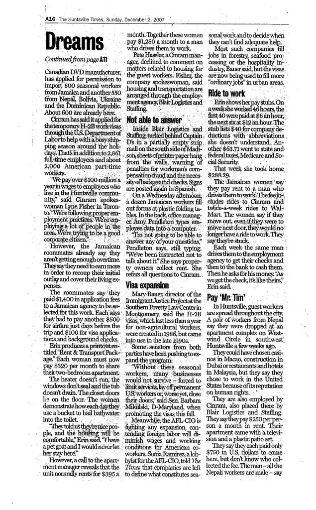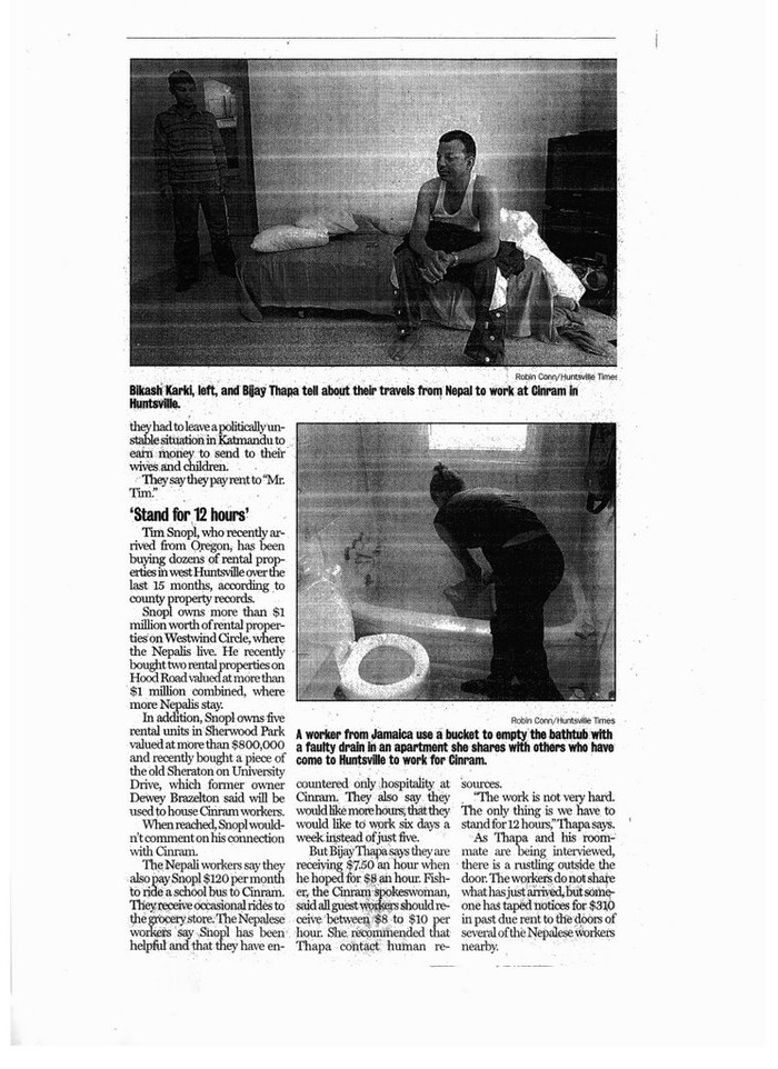 अलाबामामा राज्यको हन्स्भिलस्थित डीभीडी कारखानामा काम गर्दै आएका तीन सय नेपालीहरुमध्ये बाँकी ६० जनाको संख्यामा अझै सो कम्पनीमा कार्यरत रहेको जानकारी नेपालीपोष्टका लागि स्थानीय पत्रकार सन्तोष पोखरेलले गराउनुभएको छ । नेपालका दलाल निलेशकुमार ठाकुर, चित्र केसी म्याग्दी र विमल कार्कीमार्फत सो कम्पनीमा मजदुरी गर्न आइपुगेका नेपालीहरुलाई दलालले काठमाडौंबाट पाकिस्थान हुँदै एटलान्टा आइपुगेपछि मात्र आफूहरु अमेरिका आइपुगेको थाहा पाएको कुरा त्यहाँ आएका नेपालीहरुले पोखरेलसँगको भेटमा जनाएका छन् । १६ लाखभन्दा बढी रकम तिरेर प्रतिघण्टा आठ डलरका दरले साताको चालीस घण्टा काम गर्ने गरी आइपुगेका नेपालीहरुले नेपालमा आफू ऋणमा चुर्लुम्म डुवेका कारण अब सात महिने भिसा सकिन र कारखानाले पनि तीन दिन जम्मा २४ घण्टामात्र काम दिन थालेपछि त्यहाँबाट नेपालीहरु भाग्न थालेको जानकारी पोखरेलले नेपालीपोष्टलाई दिनुभयो । नेपालस्थित दरवारमार्गमा निर्भना अलाइन्स नामको दलाल केन्द्रमा कार्यरत मुख्य नाइके निलेशकुमार ठाकुर भने हाल अलावामा आइपुगेको र निज ठाकुरले स्थानीय समाचार एजेन्सीहरुमा समाचार निस्केपछि डीभीडी कारखाना र स्थानीय दलालले हराएका मजदूरहरुका बारेमा सोध्दा उनीहरु केही दिन न्युयोर्क घुम्न गएका हुन् फर्केर आउने कुरा बताउन थालेका छन् ।