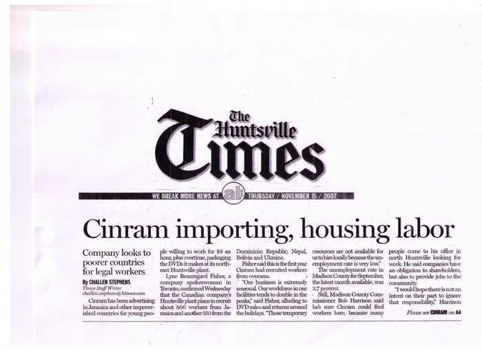couple of month ago there was an article on the huntsville times about sindram ,critising about its step to bring foreign workers. the artical said that, there are already hundreds of unemploied or part time emploied people in huntsville . it is absolutely un necessary to bring foriegn workers. therefore it is clear that there is a different motive behind bringing all there workers .