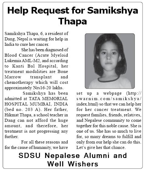 Hello everyone we are getting support and help from the Nepalese community here. I called her father yesterday. She was not still admitted for treatment. They need money as soon as possible. please give your effort to save the life of little girl. please help samikshya visit the site http://swarnim.com/samikshya to donate thank you