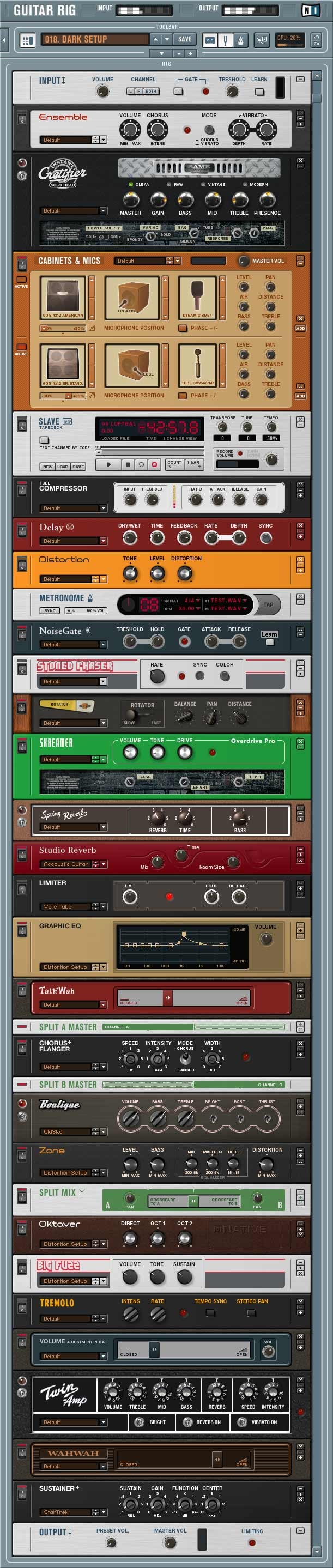 Guitar Rig 2 comes with 40 effect pedals, Amps, Cabinets and MICs catogorized into Amp & MICs, Distortions, Equilizers, Volume, Reverb, Modifiers, Tools. Each pedals that have different knobs that can be adjusted.