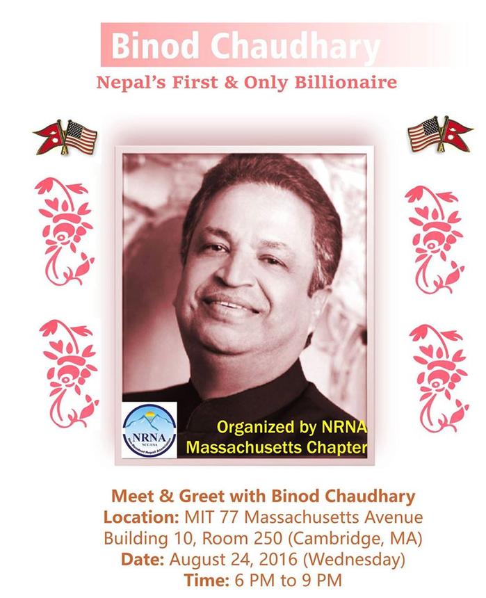 We would like to invite you to attend an interaction program with the first and only billionaire of Nepal, Binod Chaudhary on August 24th at MIT, Cambridge, MA. The program is organized by Non Resident Nepali Association (NRNA), Massachusetts Chapter. At this event, Mr. Chaudhary will talk about his two books, “Making It Big” and “Binod Chaudhary: Atmakatha”.
