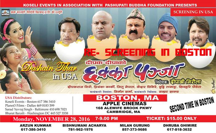 After the Historic Screening of SUPER Duper HIT Nepali Movie- "Chhakka Panja" in almost 50 US Cities and over 75 Shows. #TwoHOUSEFULL shows in BOSTON (October) and Major Cities. #3weeksScreening in DALLAS. All time Record Breaker, BOX Office Smasher, Never happened before. Now, BOSTON its the last chance to see the Movie on Thanksgiving Weekend on Monday November 28, 2016. After Boston Re-Screening, it will be out of USA. Heartfelt Thanks to All the Audience, Local Organizers, Movie Makers, Friends and Families who made this achievement a Ceiling in Movie Screening in USA.
