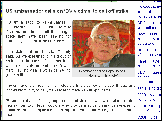 The embassy condemned these actions and called on the protesters to halt their hunger strike immediately. "If such threats interfered or halted physical examinations for immigrant visa applicants, the embassy would be unable to process any immigrant visa applications. Thousands of other Nepalis would be robbed of an opportunity to emigrate to the U.S. as a result," the statement further says.” nepalnews.com ia Apr 12 07