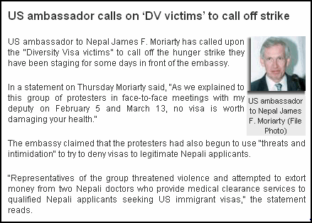 US ambassador to Nepal James F. Moriarty has called upon the "Diversity Visa victims” to call off the hunger strike they have been staging for some days in front of the embassy.